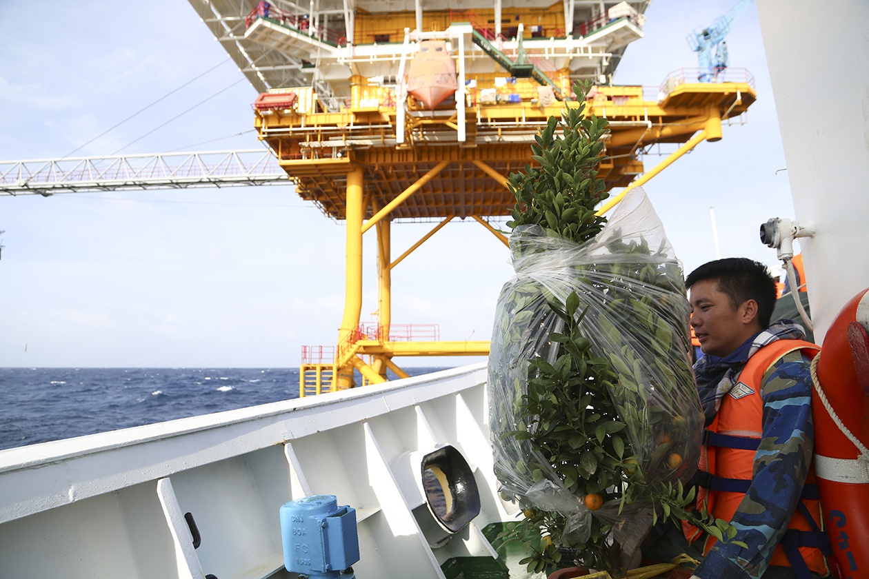 Bên mâm ngũ quả, ngắm cánh mai vàng và ăn một miếng bánh chưng mà các cán bộ, chiến sĩ Nhà giàn gói, mỗi thành viên trong đoàn công tác chúng tôi đều cảm nhận được hơi ấm từ đất liền đang lan tỏa giữa trùng khơi sóng.
