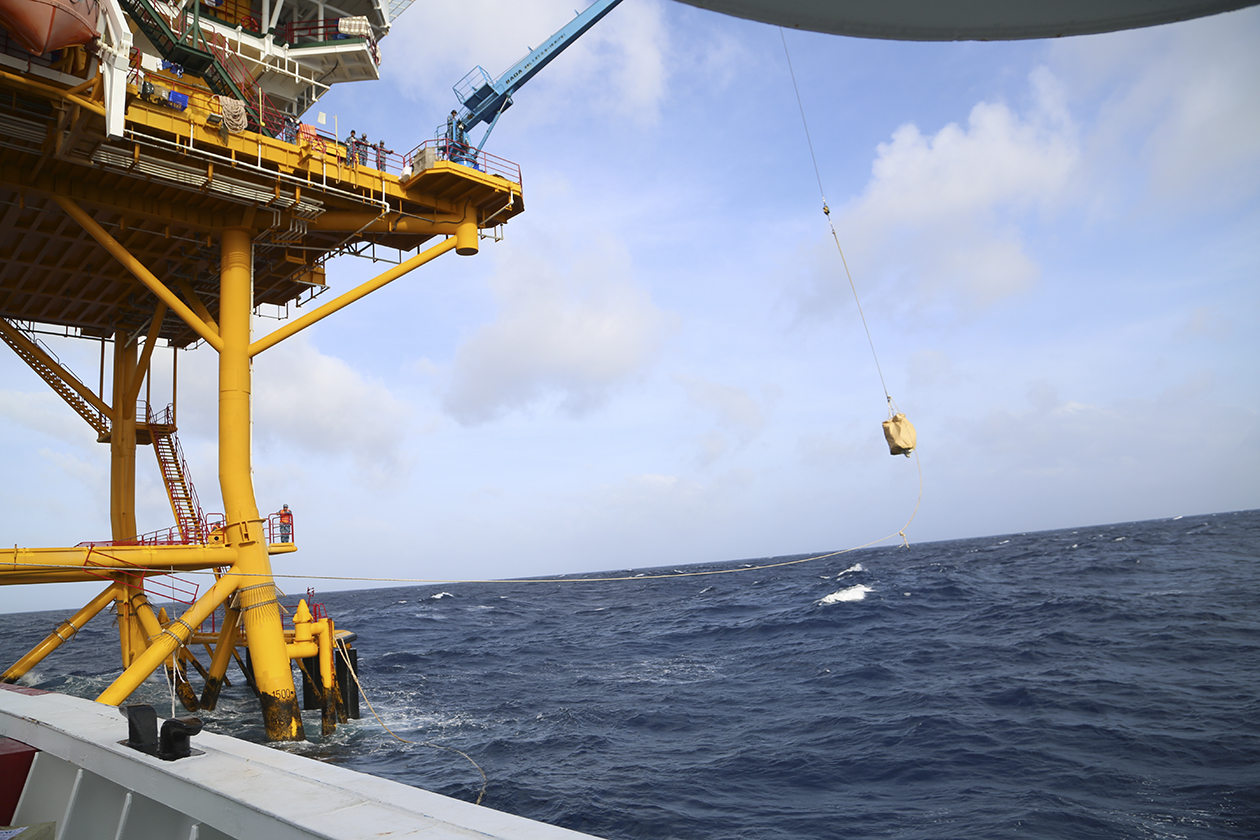 Các đại biểu lên nhà giàn bằng cách đu qua dây kéo