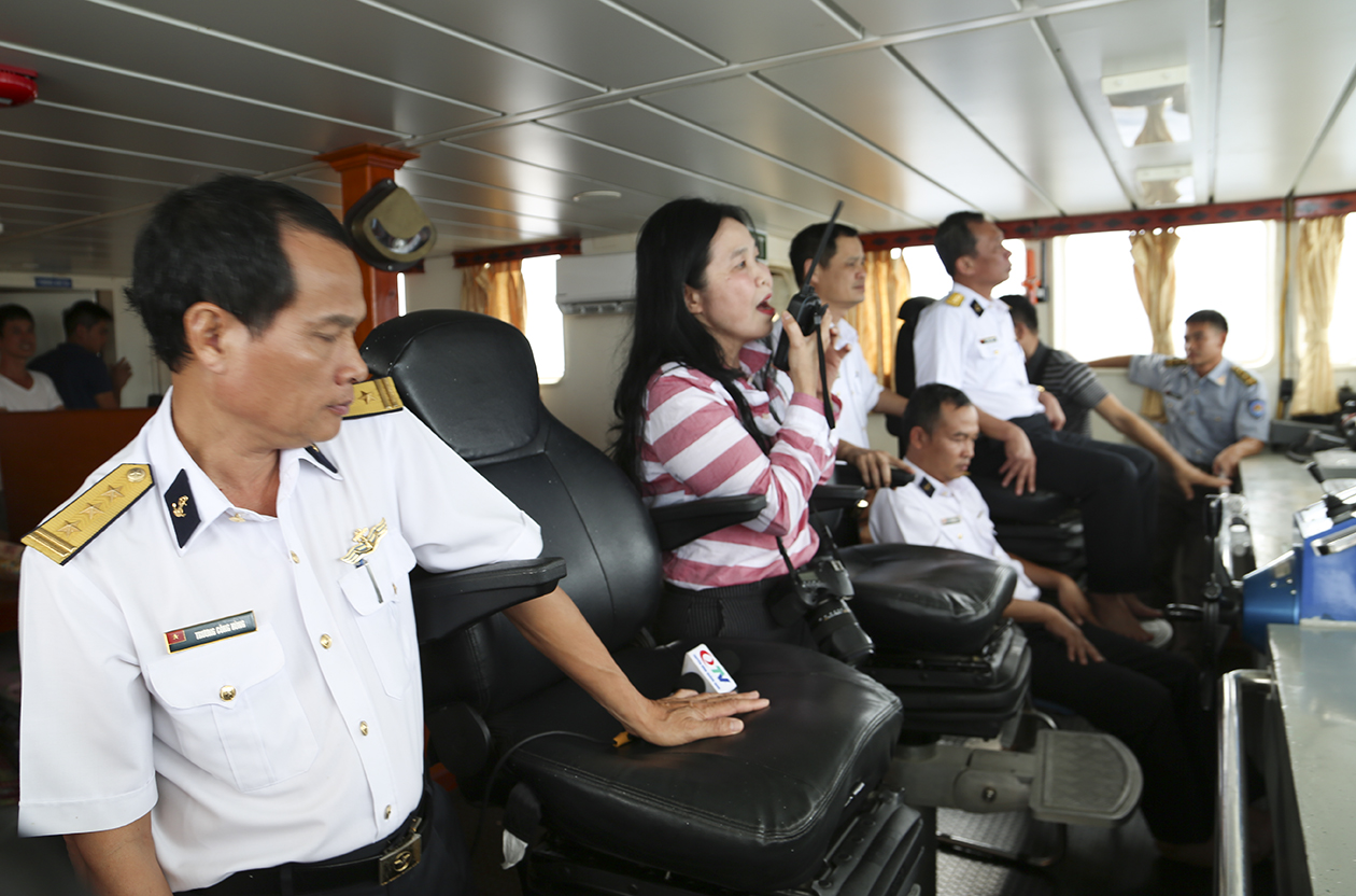 Các đại biểu giao lưu văn nghệ với cán bộ, chiến sĩ Nhà giàn qua hệ thống thông tin của tàu