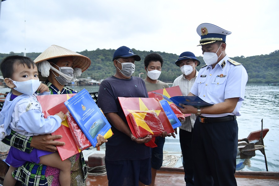 Lãnh đạo Bộ Tư lệnh Vùng 5 Hải quân và Đảng bộ Khối cơ sở Bộ Công Thương tại TP. Hồ Chí Minh tặng cờ Tổ quốc cho ngư dân