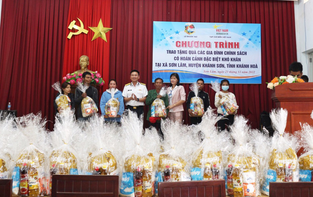 Tại Hội trường của UBND xã Sơn Lâm, đoàn công tác đã trao tặng quà và động viên các gia đình chính sách có hoàn cảnh khó khăn. Đại diện đoàn công tác đã bày tỏ mong muốn trong thời gian tới, các gia đình sẽ khắc phục khó khăn, vươn lên lao động sản xuất, ổn định cuộc sống, xây dựng quê hương. Thượng tá Mai Văn Doanh, Phó Chính uỷ Lữ đoàn 162 cho biết: Thực hiện mô hình “Hũ gạo tình thương” năm 2022, cán bộ, chiến sĩ Lữ đoàn đã đóng góp được gần 500kg gạo và ủng hộ gần 1.000 bộ quần áo đã qua sử dụng. Trong chuyến đi lần này, chỉ huy Lữ đoàn 162 phối hợp với các cơ quan, doanh nghiệp trao tặng 150 suất quà với tổng giá trị gần 60 triệu đồng.