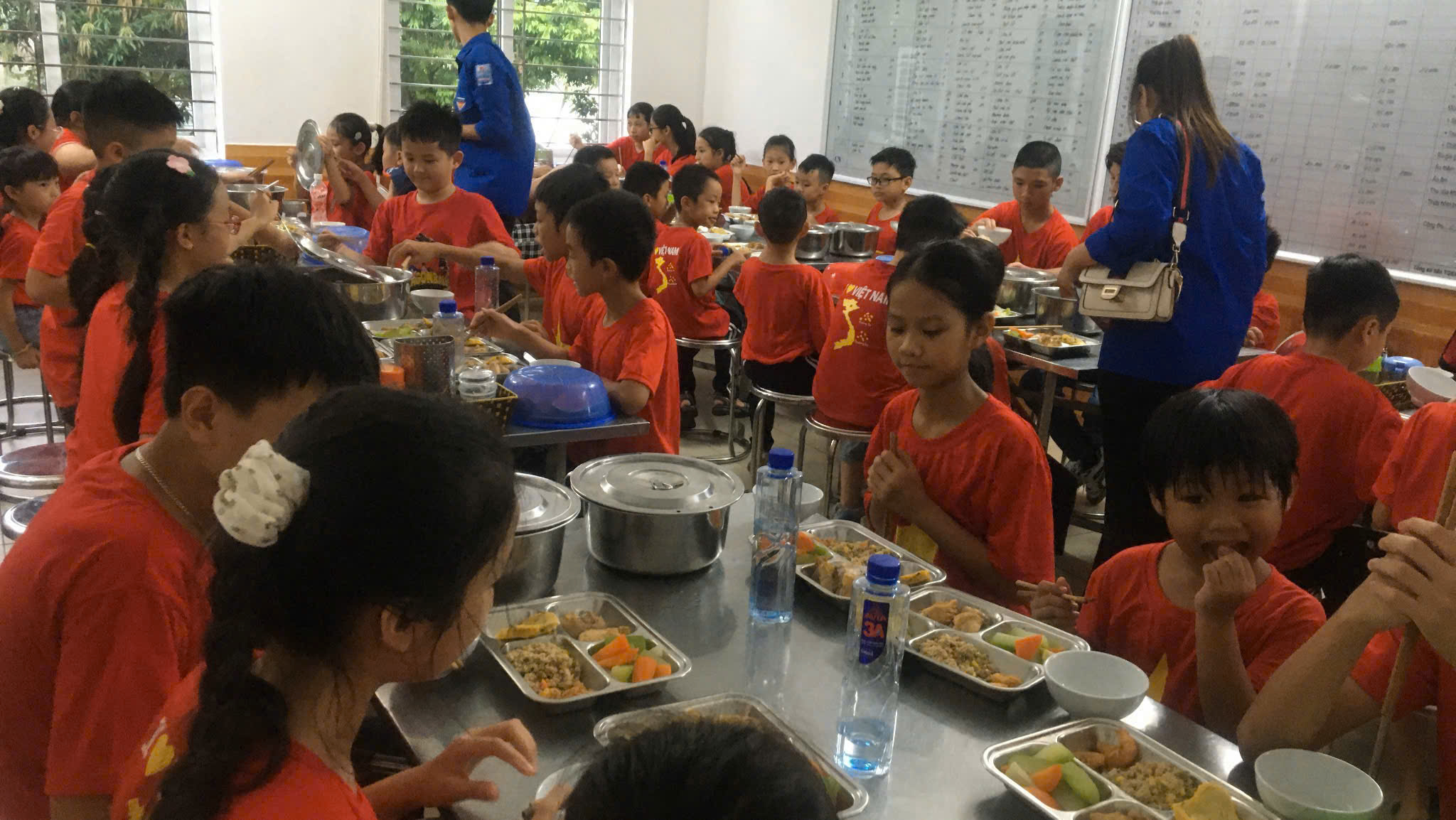 Các em học sinh trải nghiệm bữa ăn trong Quân đội