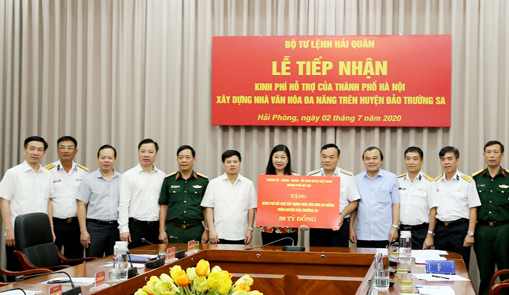 Sáng 2-7, tại Hải Phòng, Quân chủng Hải quân đã tổ chức lễ tiếp nhận kinh phí hỗ trợ trị giá 38 tỷ đồng của thành phố Hà Nội xây dựng Nhà văn hóa đa năng đảo Núi Le B, huyện đảo Trường Sa, tỉnh Khánh Hòa.