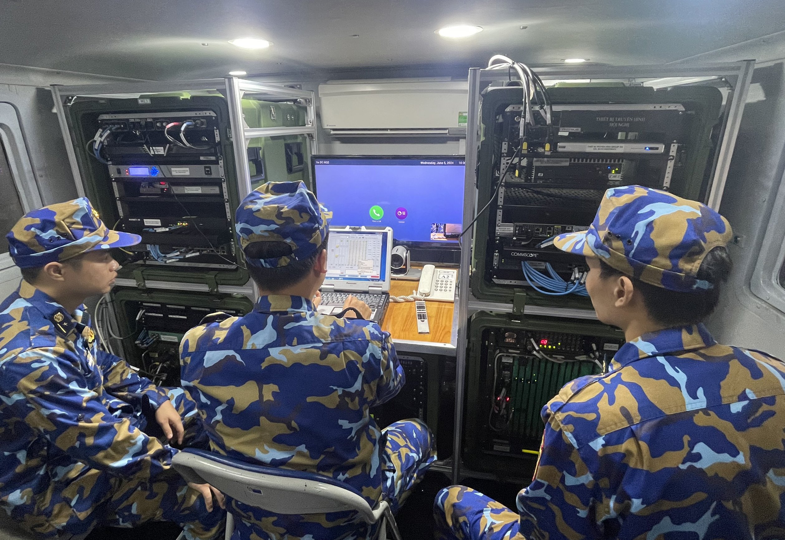 Khi sang Tiểu đoàn 2, chúng tôi chứng kiến chỉ ít phút sau hiệu lệnh của chỉ huy được phát ra, Đại úy QNCN Vũ Văn Thắng, Tiểu đội trưởng đã chỉ huy tổ đài xe đầu cuối hoàn thành nội dung dựng cột viba, vận hành các thiết bị trên xe, tích hợp các tính năng truyền tín hiệu qua cáp quang, viba, thông tin vệ tinh VSAT và tổng đài.