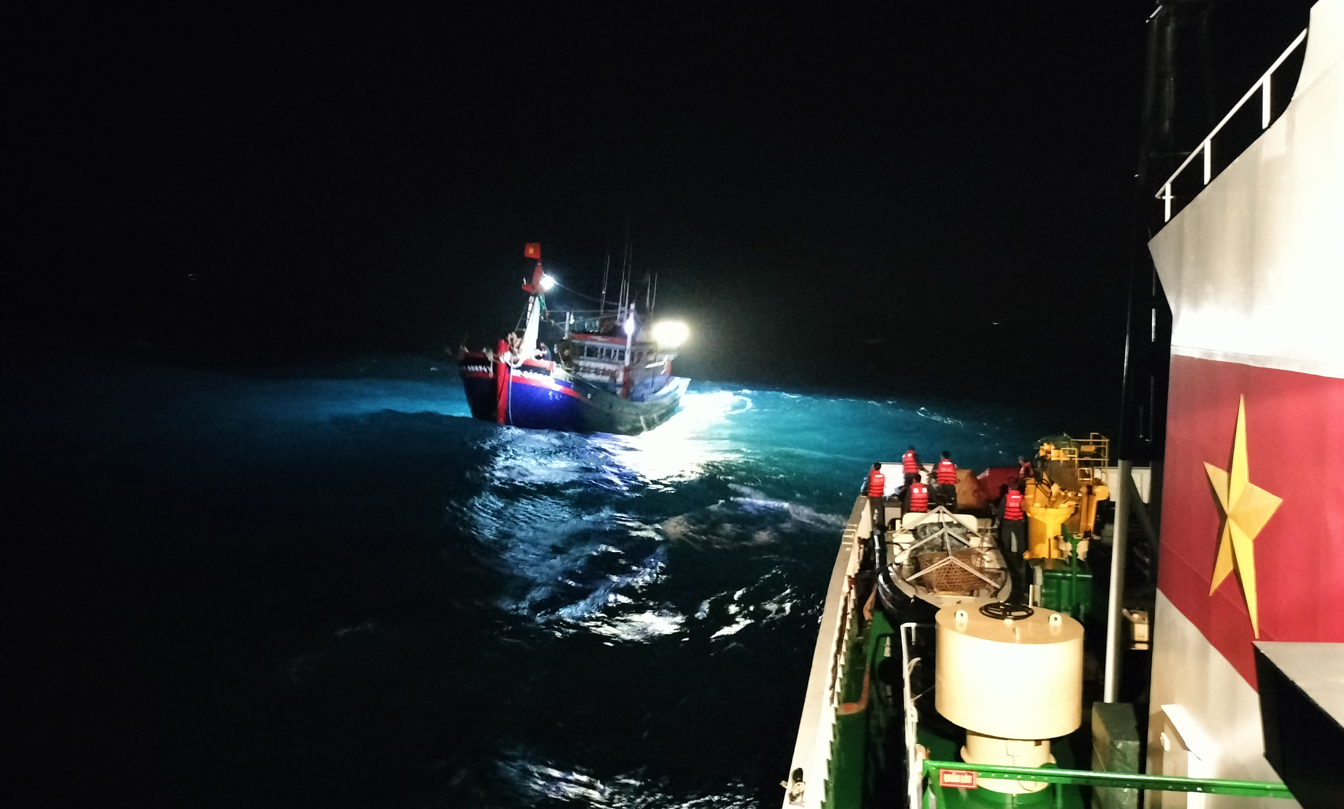 Cùng thời điểm này, tàu cá NT 91205 TS cũng đã được 1 tàu Cảnh sát biển tiếp cận và cứu kéo.