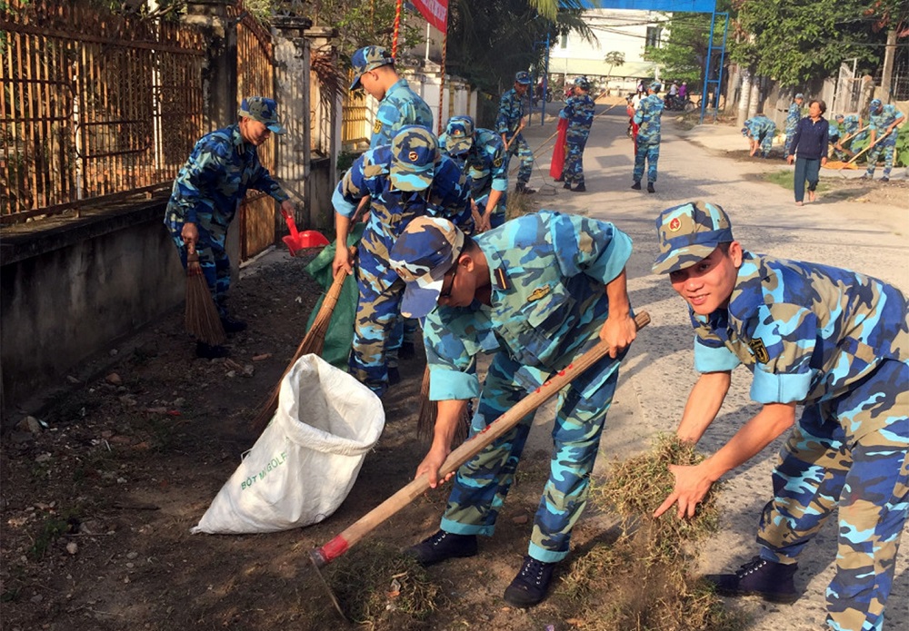 Đúng là hoạt động của thanh niên có khác, không khí làm việc luôn khẩn trương, nhanh chóng. Từng cáng đất, xe rác đã được tập kết sau một thời gian ngắn. Thông cống, vét bùn cặn ở đường nước thải tuy nặng nhọc và nặng mùi hôi nhưng vẫn được các bạn trẻ của Học viện Hải quân hăng hái làm việc. Có những bạn đây là lần đầu làm công việc này nhưng rất cẩn thận, làm đến đâu sạch đến đó. Trên tuyến đường trục xã, từng cặp thanh niên địa phương cùng với thanh niên Học viện Hải quân phối hợp nhịp nhàng dọn cỏ hai bên đường, thu gom túi ni lông, cành cây khô. Tiếng nói xen lẫn tiếng cười của những nam thanh, nữ tú luôn rộn rã. Những bộ quân phục màu xanh nước biển của học viên và những trang phục màu xanh tình nguyện của đoàn địa phương sau thời gian làm việc như hòa quyện vào nhau, trên vai áo đẫm mồ hôi và nhuốm một phần bụi cát.