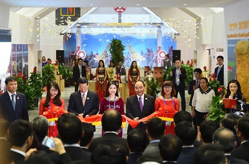Thủ tướng Nguyễn Xuân Phúc, Phó thủ tướng Trung Quốc Trương Cao Lệ cùng các đại biểu cắt băng khai trương Khu gian hàng Quốc gia danh dự chủ đề “Thành phố đẹp”.