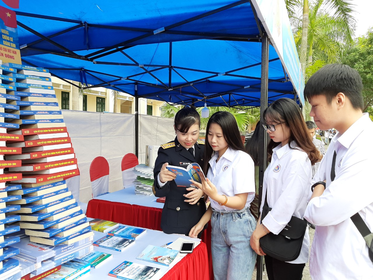 Gian trưng bày sách của Thư viện Quân chủng Hải quân được xếp theo mô hình cột mốc chủ quyền đảo Trường Sa. Nội dung các đầu sách tại gian trưng bày tập trung giới thiệu về biển, đảo Việt Nam và Hải quân Nhân dân Việt Nam đã thu hút đông đảo người xem.