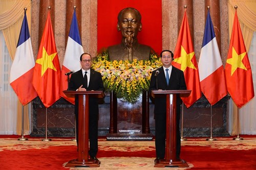 Phát biểu trong cuộc họp báo chung sau hội đàm tại Phủ Chủ tịch, Chủ tịch nước Trần Đại Quang cho biết, Chủ tịch nước và Tổng thống Francois Hollande đã thống nhất nhiều biện pháp thúc đẩy quan hệ song phương. “Chuyến thăm của Tổng thống Francois Hollande đến Việt Nam sẽ tạo ra xung lực giúp hợp tác song phương hiệu quả hơn trên các lĩnh vực như kinh tế, giáo dục”, Chủ tịch nước Trần Đại Quang nhấn mạnh.