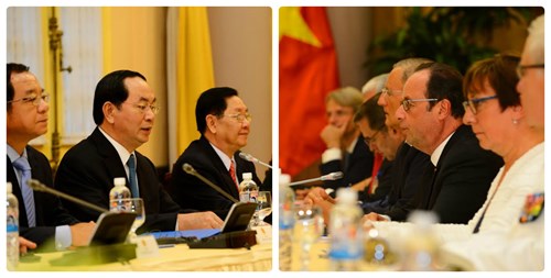 Chủ tịch nước Trần Đại Quang chào mừng Tổng thống Francois Hollande thăm cấp Nhà nước tới Việt Nam, đánh giá cao ý nghĩa của chuyến thăm đối với quan hệ hai nước. Tổng thống Francois Hollande bày tỏ vui mừng tới thăm đất nước Việt Nam tươi đẹp, khẳng định mong muốn chuyến thăm sẽ thúc đẩy hơn nữa quan hệ Đối tác chiến lược giữa hai nước.