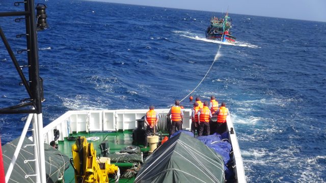 Tàu Chi đội Kiểm ngư số 4 cứu kéo tàu cá gặp nạn trên biển. Ảnh: CTV