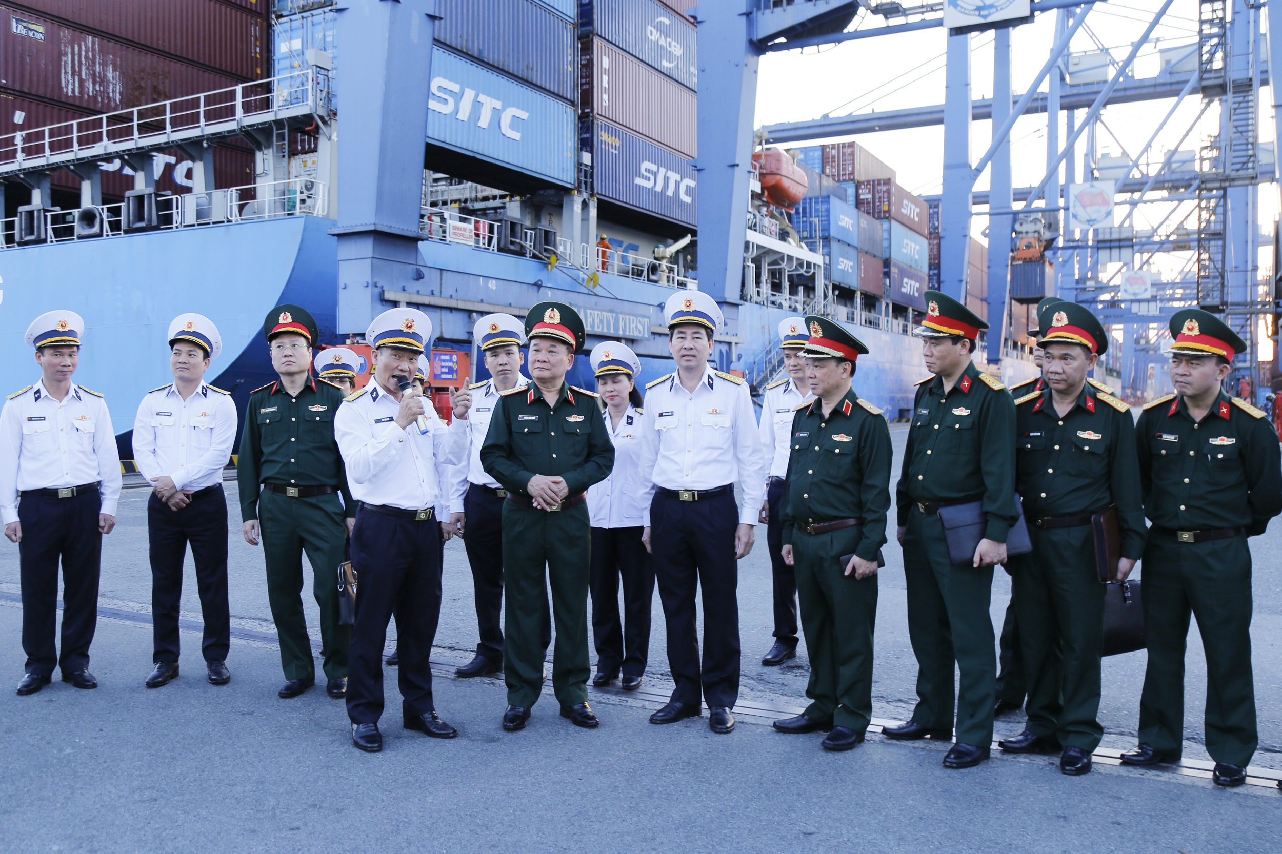 Sau khi kiểm tra công tác sẵn sàng chiến đấu, hoạt động sản xuất kinh doanh tại cảng Tân cảng Cát Lái, Thượng tướng Hoàng Xuân Chiến và đoàn công tác có buổi làm việc với lãnh đạo Tổng công ty Tân cảng Sài Gòn.