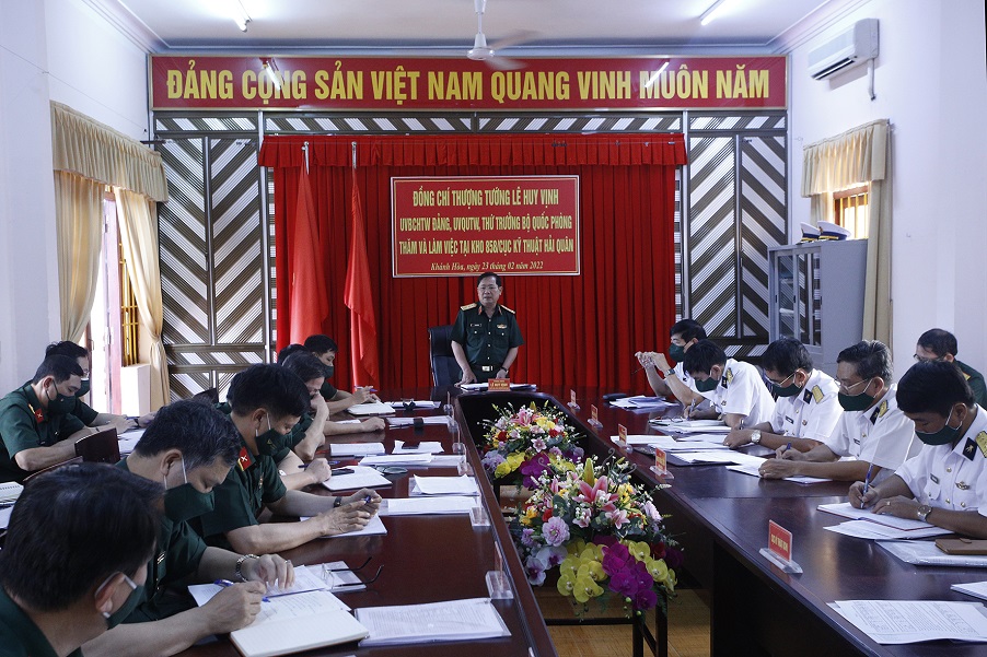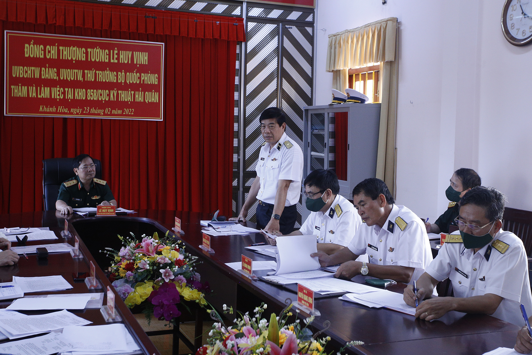 Chiều 23/2, tại TP. Cam Ranh, tỉnh Khánh Hòa, Thượng tướng Lê Huy Vịnh, Ủy viên Trung ương Đảng, Ủy viên Quân ủy Trung ương, Thứ trưởng Bộ Quốc phòng đã đến thăm và làm việc tại Kho 858, Cục Kỹ thuật Hải quân. Tham gia đoàn công tác có Trung tướng Trần Minh Đức, Chủ nhiệm Tổng cục Kỹ thuật; Chuẩn Đô đốc Phan Tuấn Hùng, Phó Tư lệnh Hải quân cùng các cơ quan chức năng của Bộ Quốc phòng và Quân chủng Hải quân.