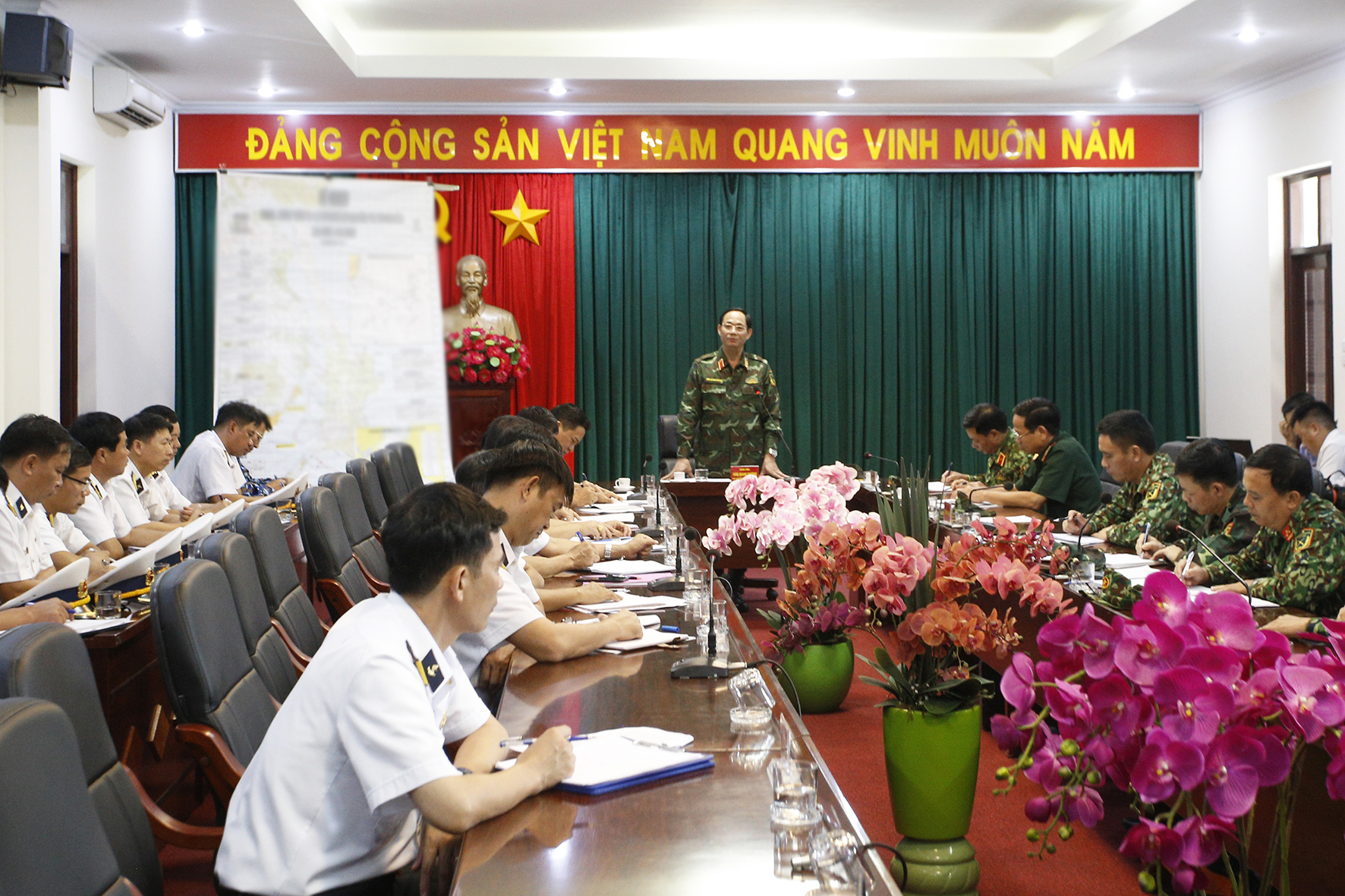 Sau khi đi kiểm tra, nắm tình hình thực tế tại Lữ đoàn 101, Vùng 4 và Chi đội Kiểm ngư số 4, Thượng tướng Trần Quang Phương đã nghe chỉ huy Vùng 4 báo cáo công tác chuẩn bị về lực lượng, phương tiện và phương án ứng phó cơn bão số 9.