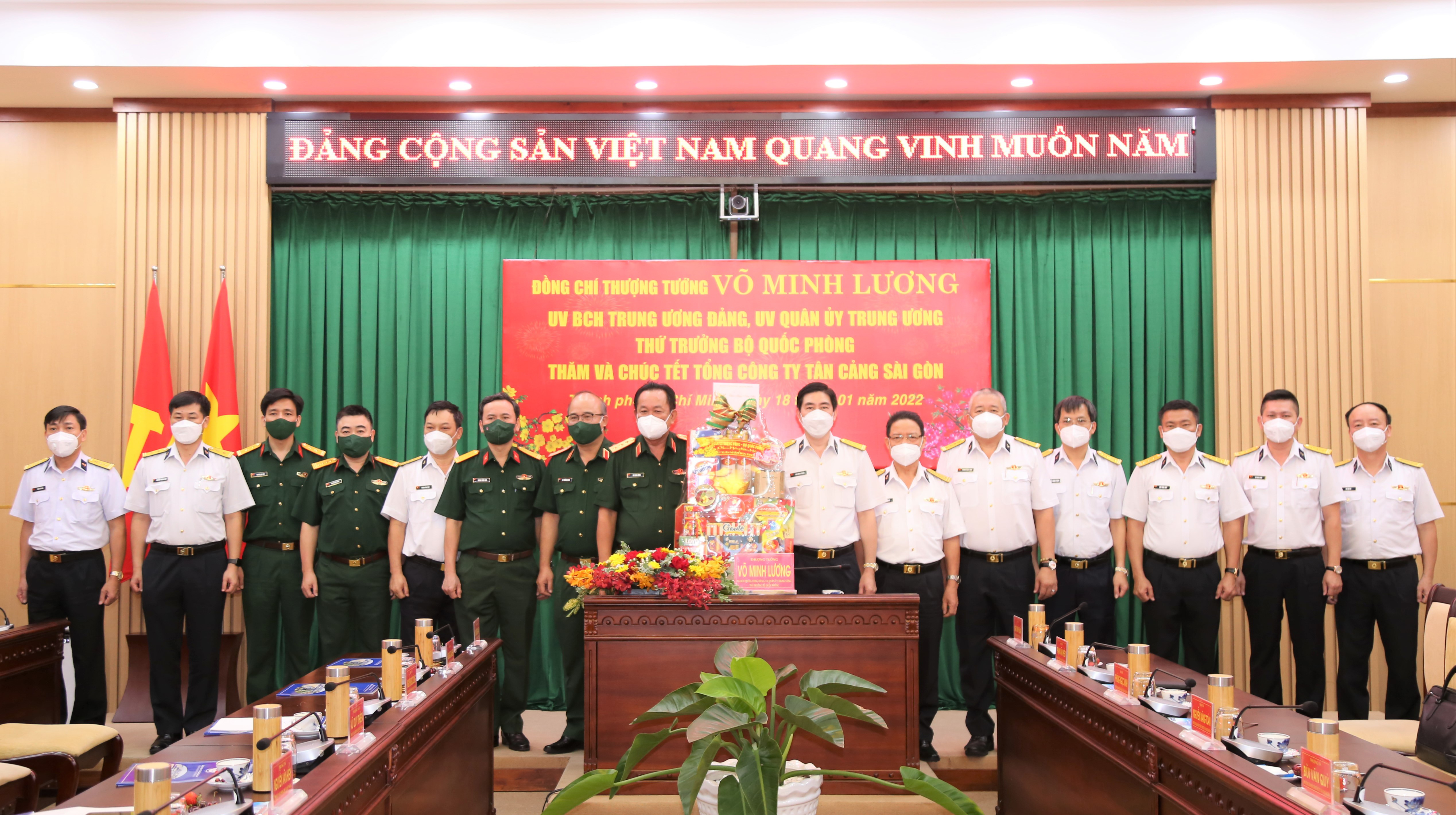 Nhân dịp này, thay mặt lãnh đạo Bộ Quốc phòng, Thượng tướng Võ Minh Lương đã tặng quà Tết cán bộ, công nhân viên, người lao động TCT Tân cảng Sài Gòn.