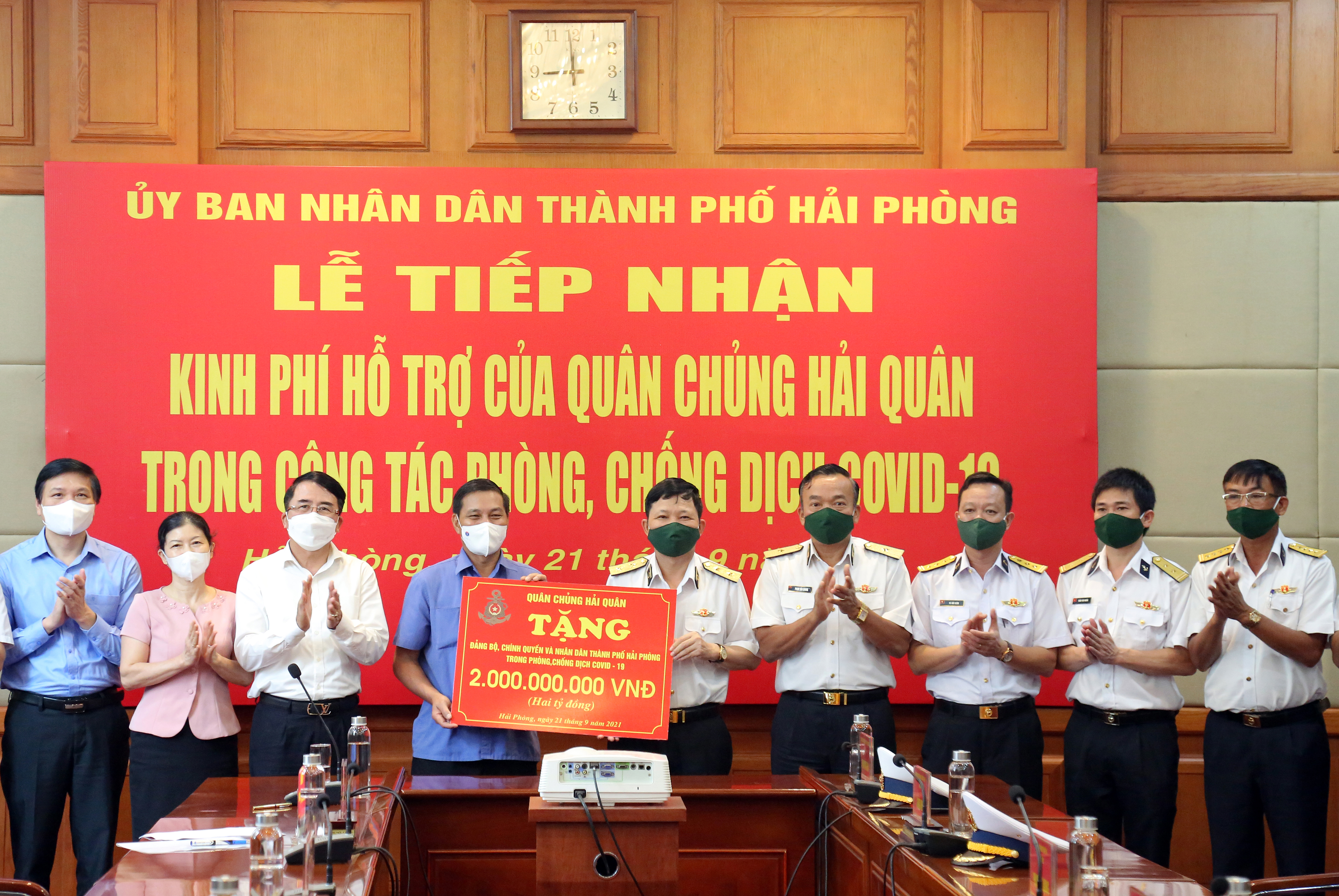 Trung tướng Nguyễn Văn Bổng trao bảng tượng trưng kinh phí ủng hộ TP. Hải Phòng chống dịch Covid-19. Ảnh: Quang Thanh