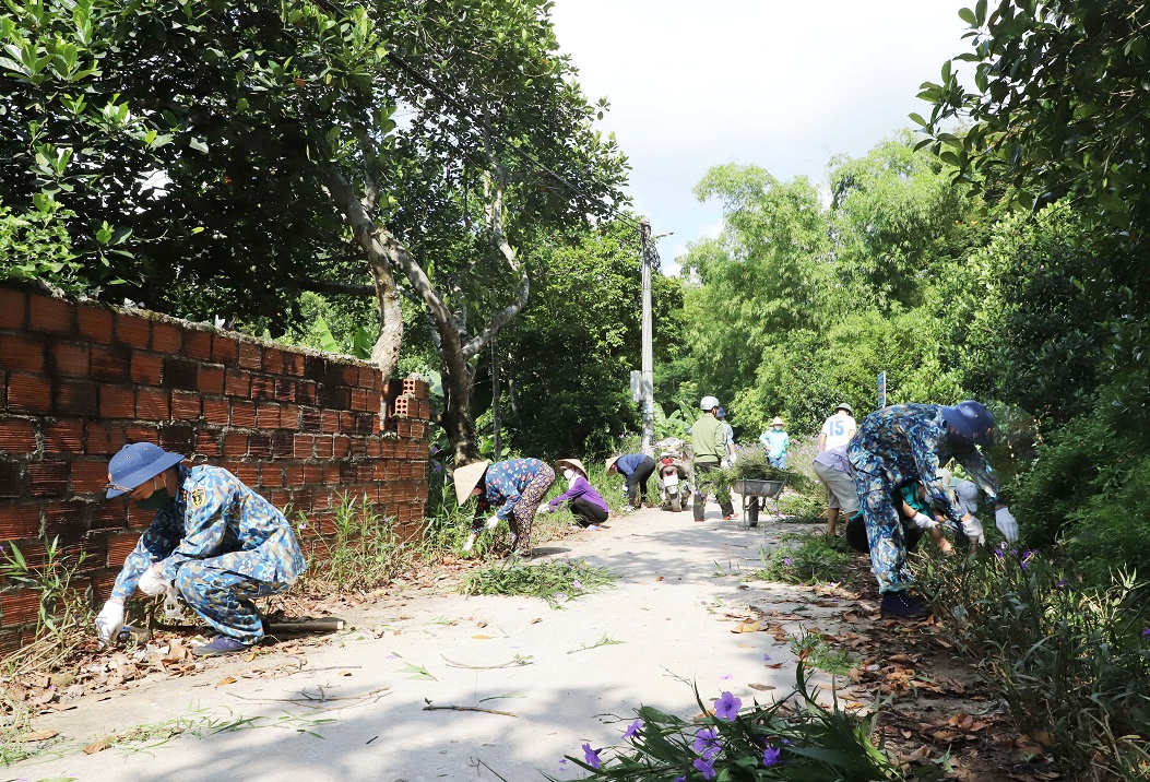 Cán bộ, đoàn viên Tiểu đoàn 151 và các đoàn thể địa phương đã tổng dọn vệ sinh thôn 6, thôn 7 xã Hòa Bình, cắt tỉa cây xanh, đường hoa, thu gom rác thải và nạo vét kênh mương thoát nước...