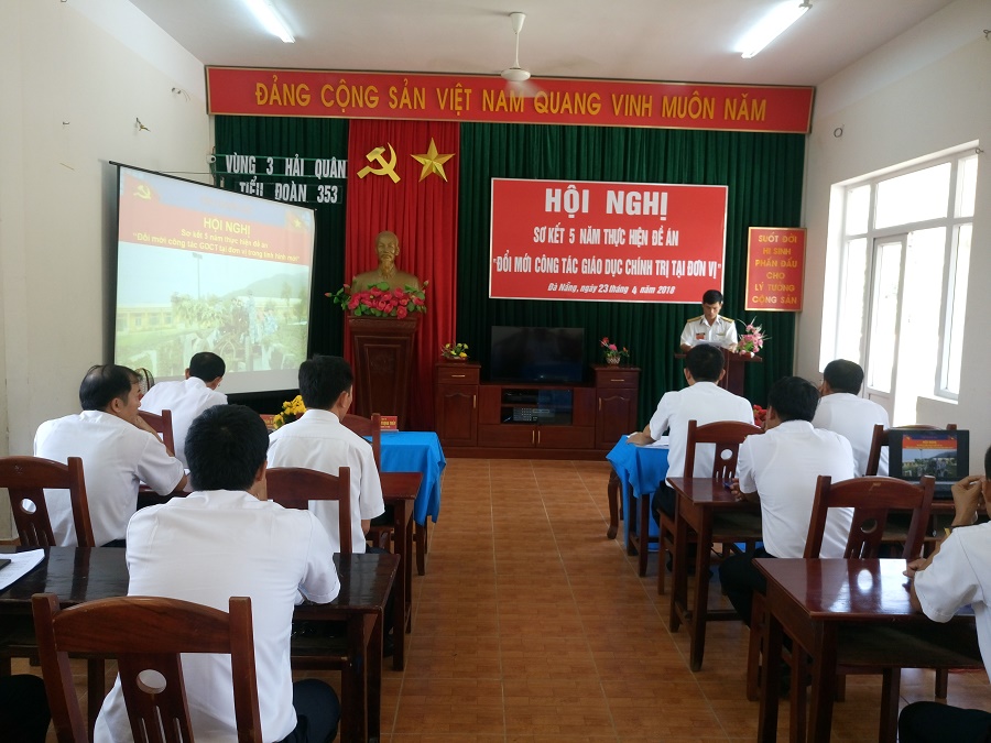 Ngày 23-4, tại Đà Nẵng, Tiểu đoàn 353, Vùng 3 Hải quân đã tổ chức Hội nghị sơ kết 5 năm thực hiện đề án “Đổi mới công tác giáo dục chính trị tại đơn vị trong giai đoạn mới”. Đây là Hội nghị làm trước để rút kinh nghiệm trong toàn Vùng. Tới dự có Đại tá Huỳnh Trọng Thủy, Phó Chính ủy Vùng.