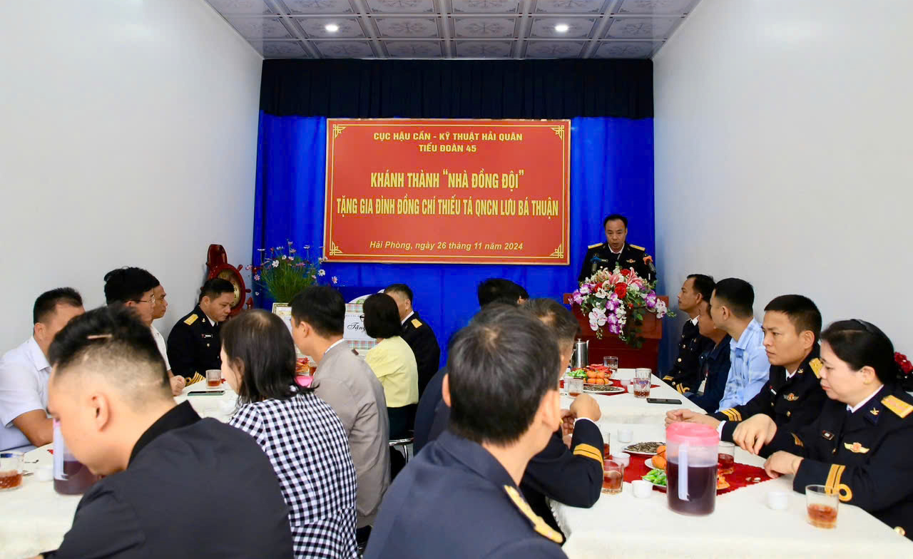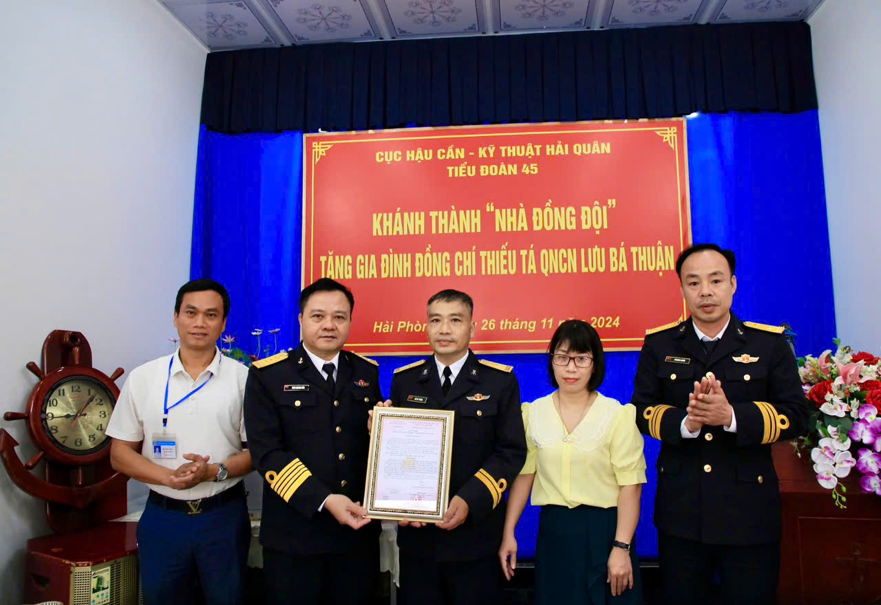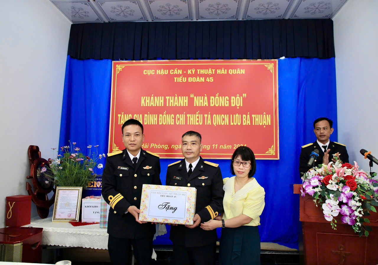 Sáng 26/11, Tiểu đoàn 45, Cục Hậu cần-Kỹ thuật Hải quân tổ chức khánh thành nhà đồng đội tặng Thiếu tá QNCN Lưu Bá Thuận, Thợ sửa chữa của đơn vị, trú tại tổ dân phố Đẩu Sơn 2, phường Văn Đẩu, quận Kiến An, TP. Hải Phòng.