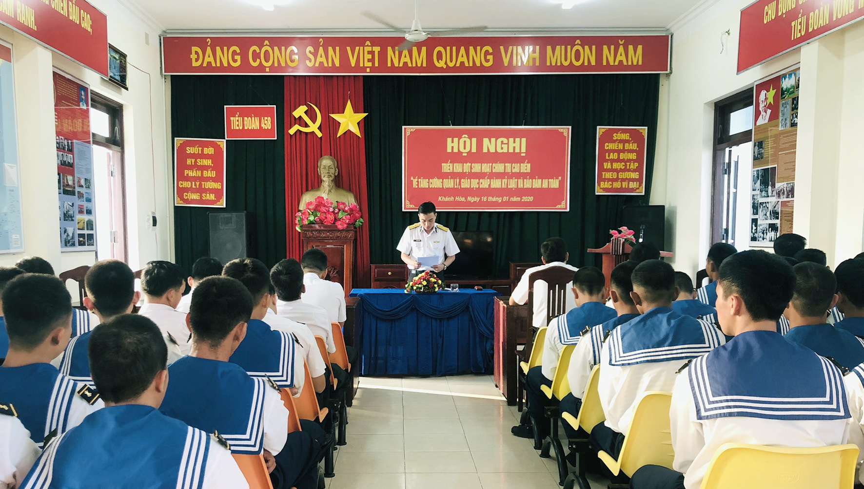 Sáng 16-1, tại Căn cứ quân sự Cam Ranh (Khánh Hòa), Tiểu đoàn 458, Vùng 4 Hải quân đã tổ chức Hội nghị triển khai đợt sinh hoạt chính trị cao điểm về tăng cường quản lý, giáo dục chấp hành kỷ luật và bảo đảm an toàn với chủ đề: “Kỷ luật là sức mạnh của Quân đội, nét đẹp văn hóa của Bộ đội Cụ Hồ-Người chiến sĩ Hải quân”.