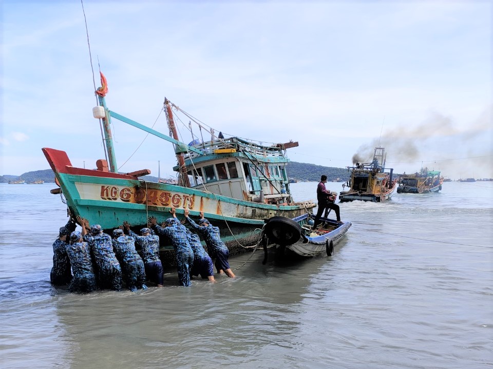 Chiều 21-9, cán bộ, chiến sĩ Tiểu đoàn 563, Vùng 5 Hải quân cùng người dân địa phương đã kéo được tàu cá Kiên Giang số hiệu KG 60456 TS ra khỏi nơi mắc cạn.