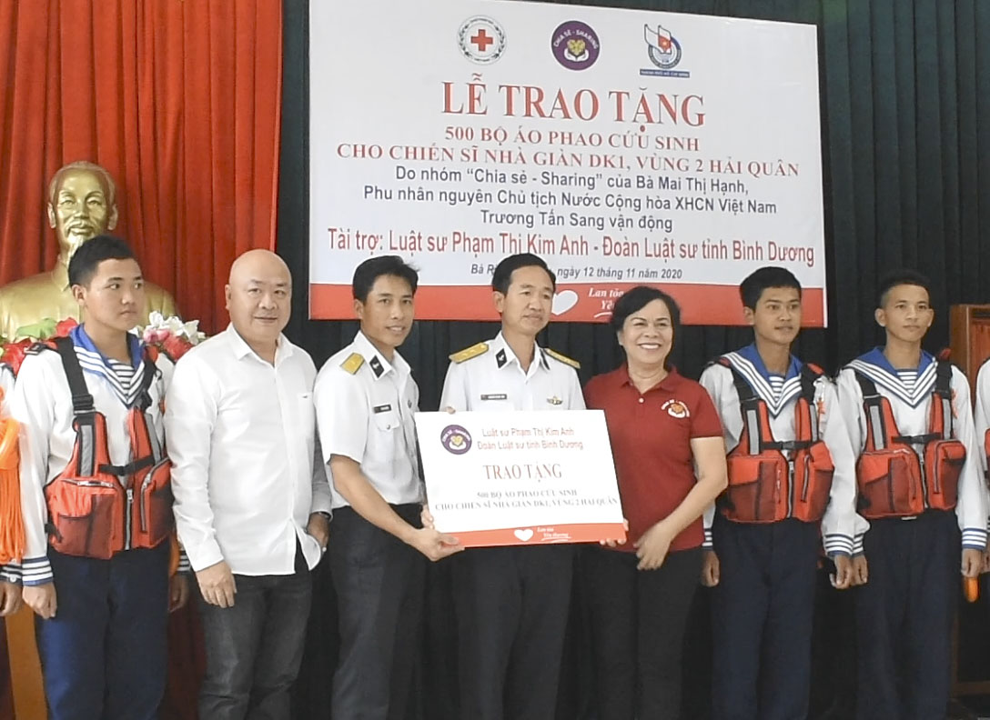 Đợt này, Tiểu đoàn DK1 tiếp nhận 500 bộ áo phao cứu sinh, nguồn kinh phí mua áo do Luật sư Phạm Thị Kim Anh, đoàn Luật sư Bình Dương tài trợ.
