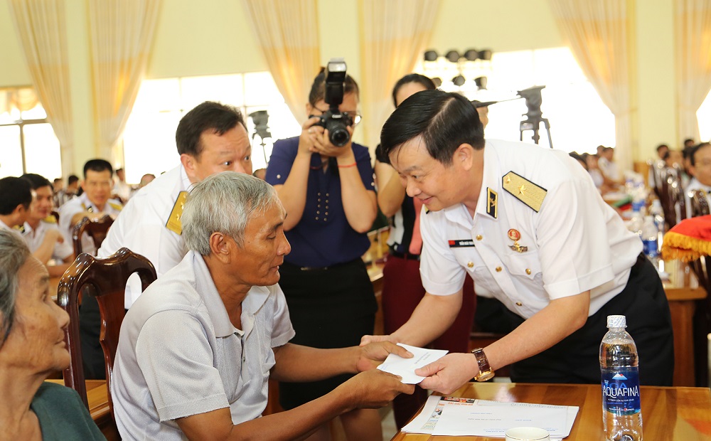 Thay mặt Đảng ủy, Bộ Tư lệnh Hải quân, Thiếu tướng Trần Hoài Trung đã trao tặng 10 phần quà đến các Mẹ Việt Nam anh hùng, đối tượng chính sách của tỉnh An Giang.