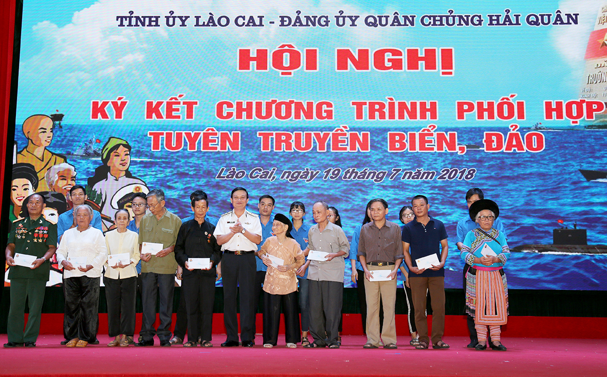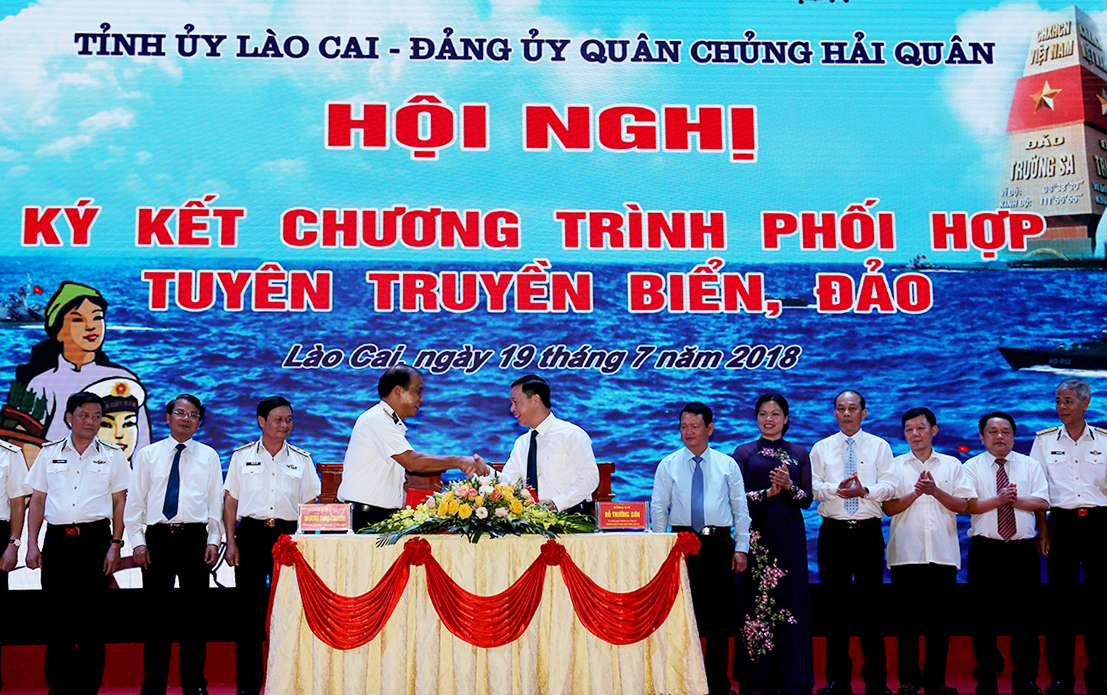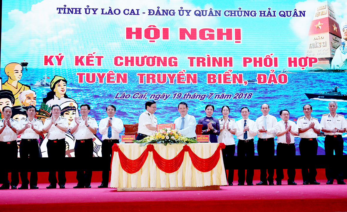 Chiều 19-7, tại Trung tâm hội nghị tỉnh Lào Cai đã diễn ra Hội nghị ký kết Chương trình phối hợp tuyên truyền biển, đảo giữa Tỉnh ủy Lào Cai và Đảng ủy Quân chủng Hải quân. Đồng chí Nguyễn Văn Vịnh, Ủy viên Trung ương Đảng, Bí thư Tỉnh ủy, Chủ tịch HĐND tỉnh Lào Cai và Phó Đô đốc Trần Hoài Trung, Bí thư Đảng ủy, Chính ủy Hải quân chủ trì hội nghị.