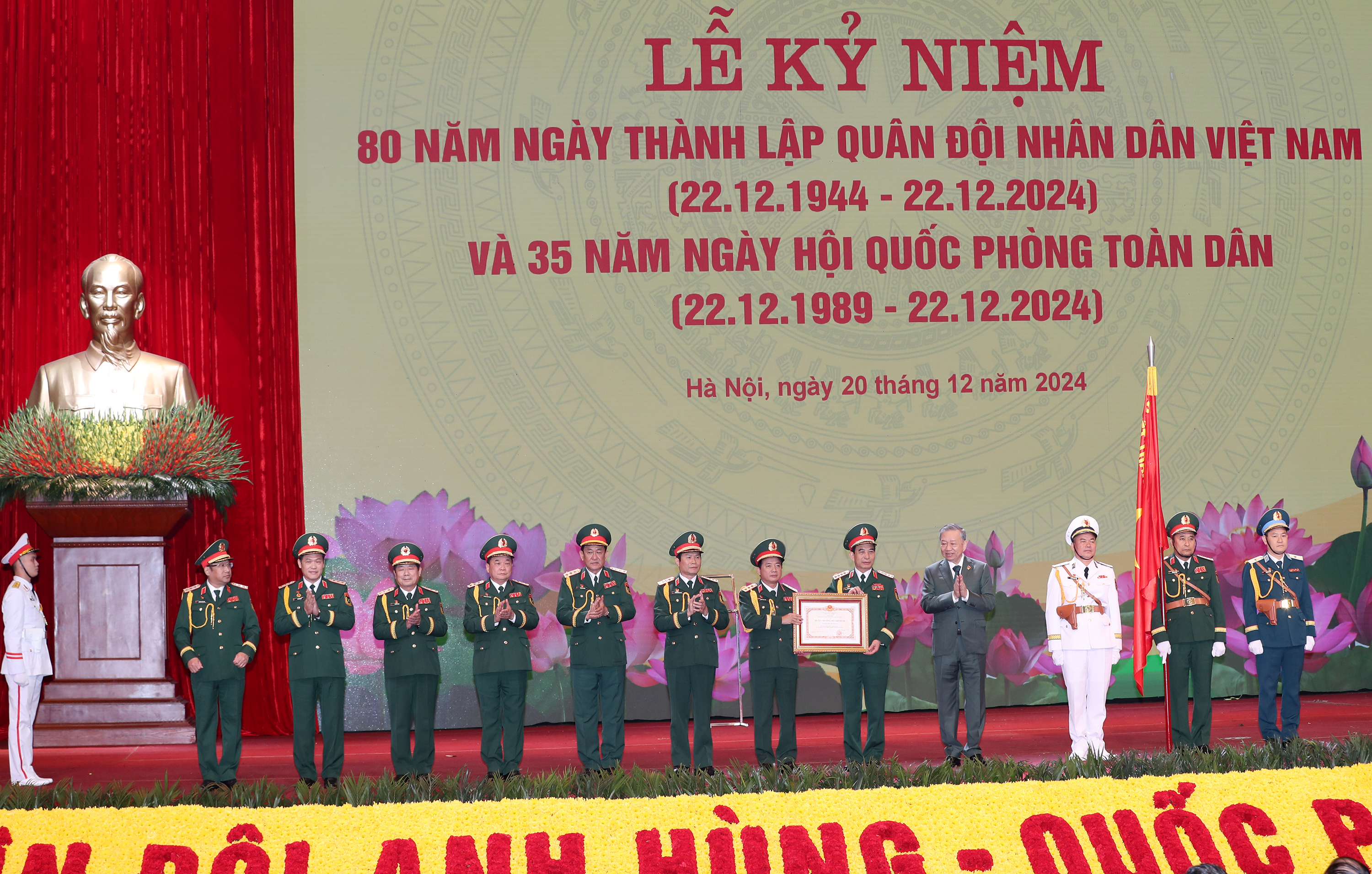 Sáng 20/12, tại Trung tâm Hội nghị quốc gia (Thủ đô Hà Nội), Ban Chấp hành Trung ương Đảng Cộng sản Việt Nam, Quốc hội, Chủ tịch nước, Chính phủ, Ủy ban Trung ương Mặt trận Tổ quốc Việt Nam và Quân ủy Trung ương, Bộ Quốc phòng trọng thể tổ chức Lễ kỷ niệm 80 năm Ngày thành lập Quân đội nhân dân (QĐND) Việt Nam (22/12/1944 - 22/12/2024) và 35 năm Ngày hội quốc phòng toàn dân (22/12/1989- 22/12/2024). Đồng chí Tổng Bí thư Tô Lâm, Bí thư Quân ủy Trung ương tham dự lễ kỷ niệm.