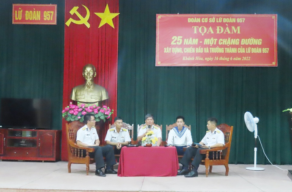 Tối 16/6, tại TP. Cam Ranh, tỉnh Khánh Hòa, Đoàn cơ sở Lữ đoàn 957 tổ chức tọa đàm với chủ đề “25 năm, một chặng đường – xây dựng, chiến đấu và trưởng thành”, chào mừng kỷ niệm 25 năm thành lập đơn vị (20/6/1997-20/6/2022).