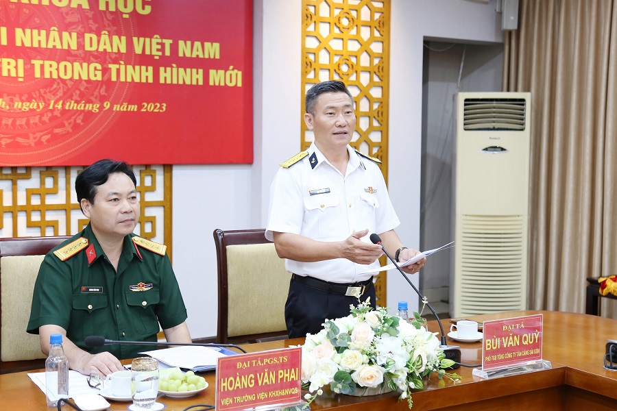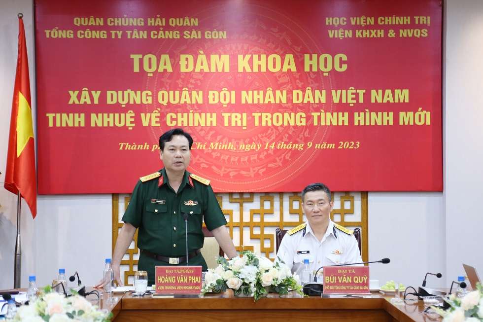 Ngày 14 và 15/9, tại TP. Hồ Chí Minh và tỉnh Bà Rịa - Vũng Tàu, Viện Khoa học xã hội và nhân văn quân sự (KHXH&NVQS) thuộc Học viện Chính trị phối hợp với Tổng công ty (TCT) Tân cảng Sài Gòn tổ chức tọa đàm khoa học: Xây dựng QĐND Việt Nam tinh nhuệ về chính trị trong tình hình mới. Đại tá, PGS, TS Hoàng Văn Phai, Viện trưởng Viện KHXH&NVQS và Đại tá Bùi Văn Quỳ, Phó Tổng giám đốc TCT Tân cảng Sài Gòn đồng chủ trì.