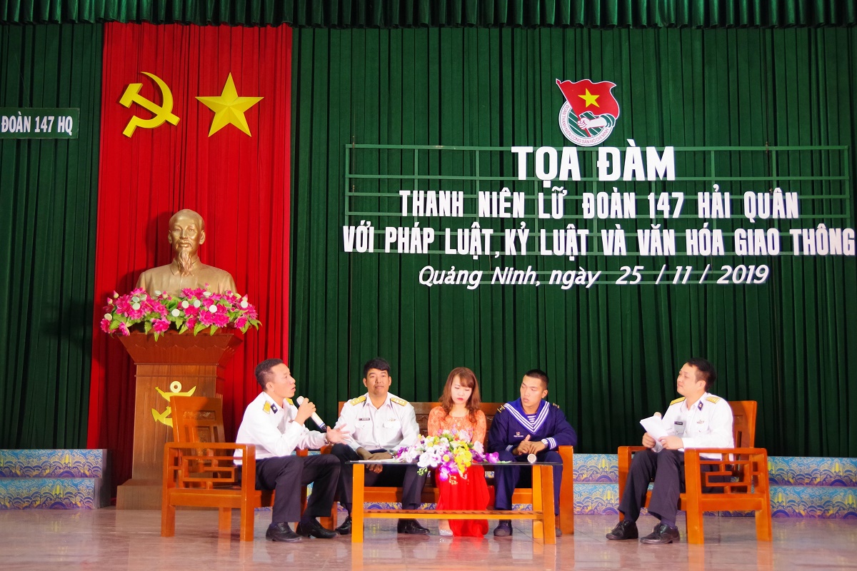 Tối ngày 25-11, tại Quảng Ninh, Đoàn cơ sở Lữ đoàn 147, Vùng 1 Hải quân tổ chức tọa đàm với chủ đề: “Thanh niên Lữ đoàn 147 Hải quân với pháp luật, kỷ luật và văn hóa giao thông”. Tham dự có các đồng chí trong Đảng ủy, chỉ huy Lữ đoàn; đại biểu, đoàn viên, thanh niên đơn vị kết nghĩa và gần 400 cán bộ, đoàn viên Lữ đoàn.