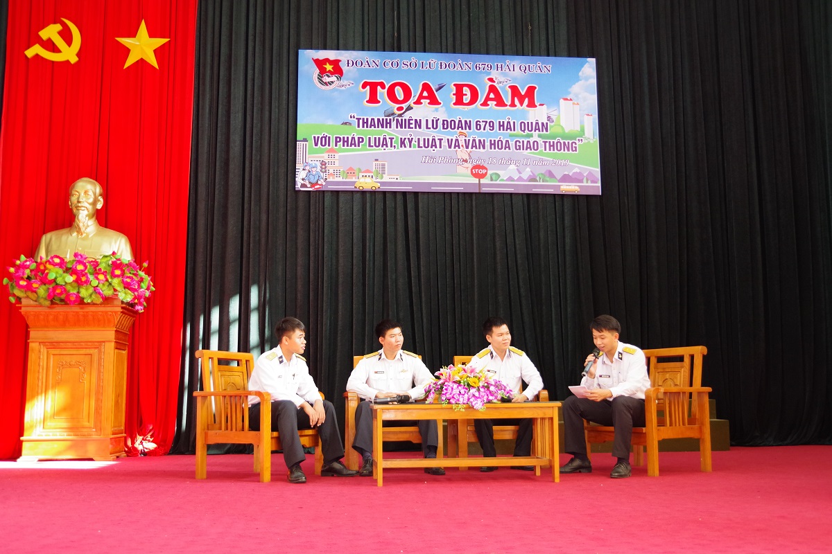 Chiều 18-11, tại Hải Phòng, Đoàn cơ sở Lữ đoàn 679, Vùng 1 Hải quân tổ chức tọa đàm với chủ đề: “Thanh niên Lữ đoàn 679 Hải quân với pháp luật, kỷ luật và văn hóa giao thông”. Tham dự tọa đàm có lãnh đạo, chỉ huy Lữ đoàn; đại biểu các đơn vị kết nghĩa trên địa bàn và cán bộ, chiến sĩ, đoàn viên, thanh niên Lữ đoàn.