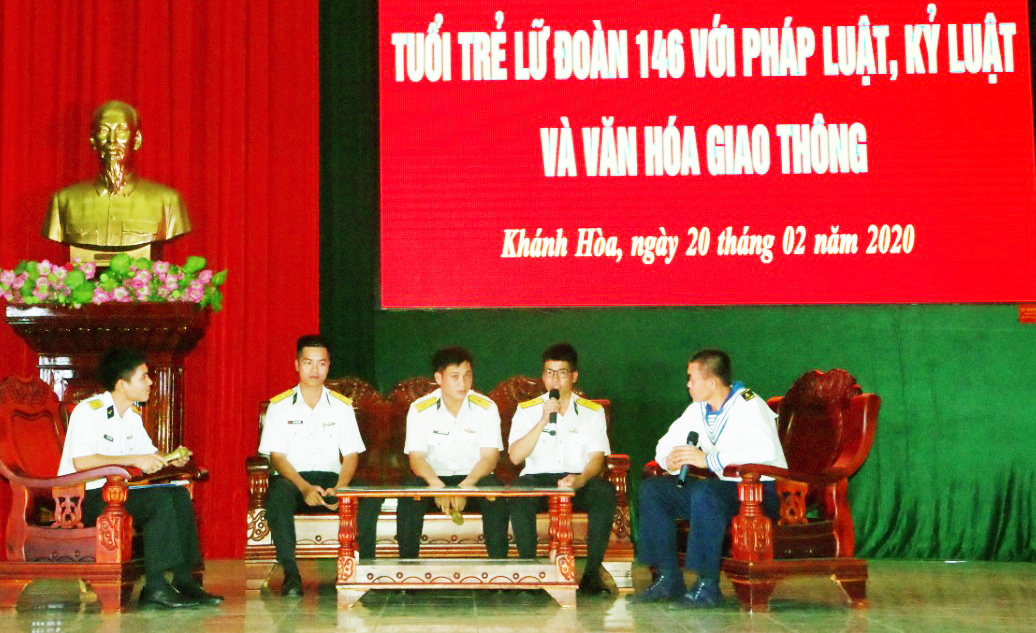 Tối 20-2, tại Khánh Hòa, Đoàn cơ sở Lữ đoàn 146, Vùng 4 Hải quân tổ chức tọa đàm với chủ đề “Tuổi trẻ Lữ đoàn 146 với pháp luật, kỷ luật và văn hóa giao thông”. Thượng tá Lương Xuân Giáp, Bí thư Đảng ủy, Chính ủy Lữ đoàn dự và chỉ đạo.