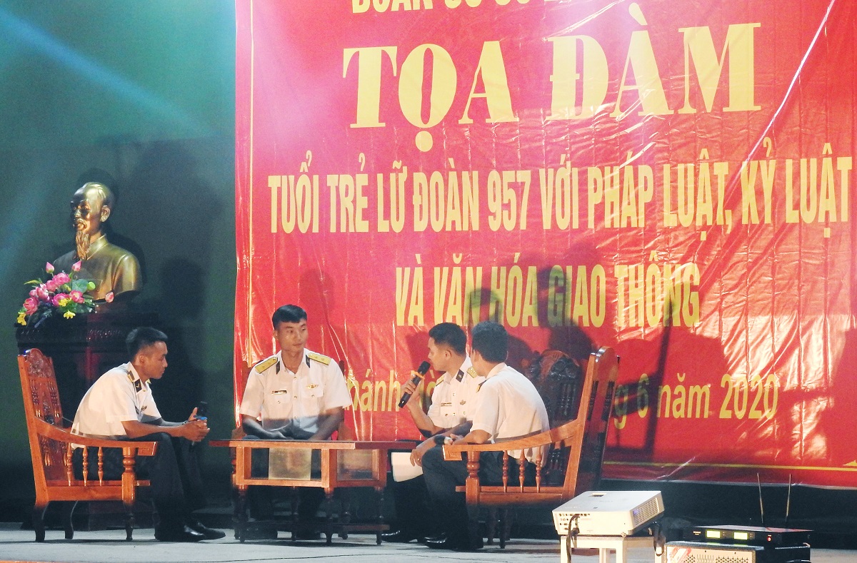 Tối 22-6, tại TP. Cam Ranh, tỉnh Khánh Hòa, Đoàn cơ sở Lữ đoàn 957, Vùng 4 Hải quân tổ chức tọa đàm với chủ đề “Tuổi trẻ Lữ đoàn 957 với pháp luật, kỷ luật và văn hóa giao thông”. Đại tá Phạm Quang Trung, Bí thư Đảng ủy, Chính ủy Lữ đoàn dự và chỉ đạo. Tham dự tọa đàm có hơn 650 cán bộ, đoàn viên thanh niên Lữ đoàn.