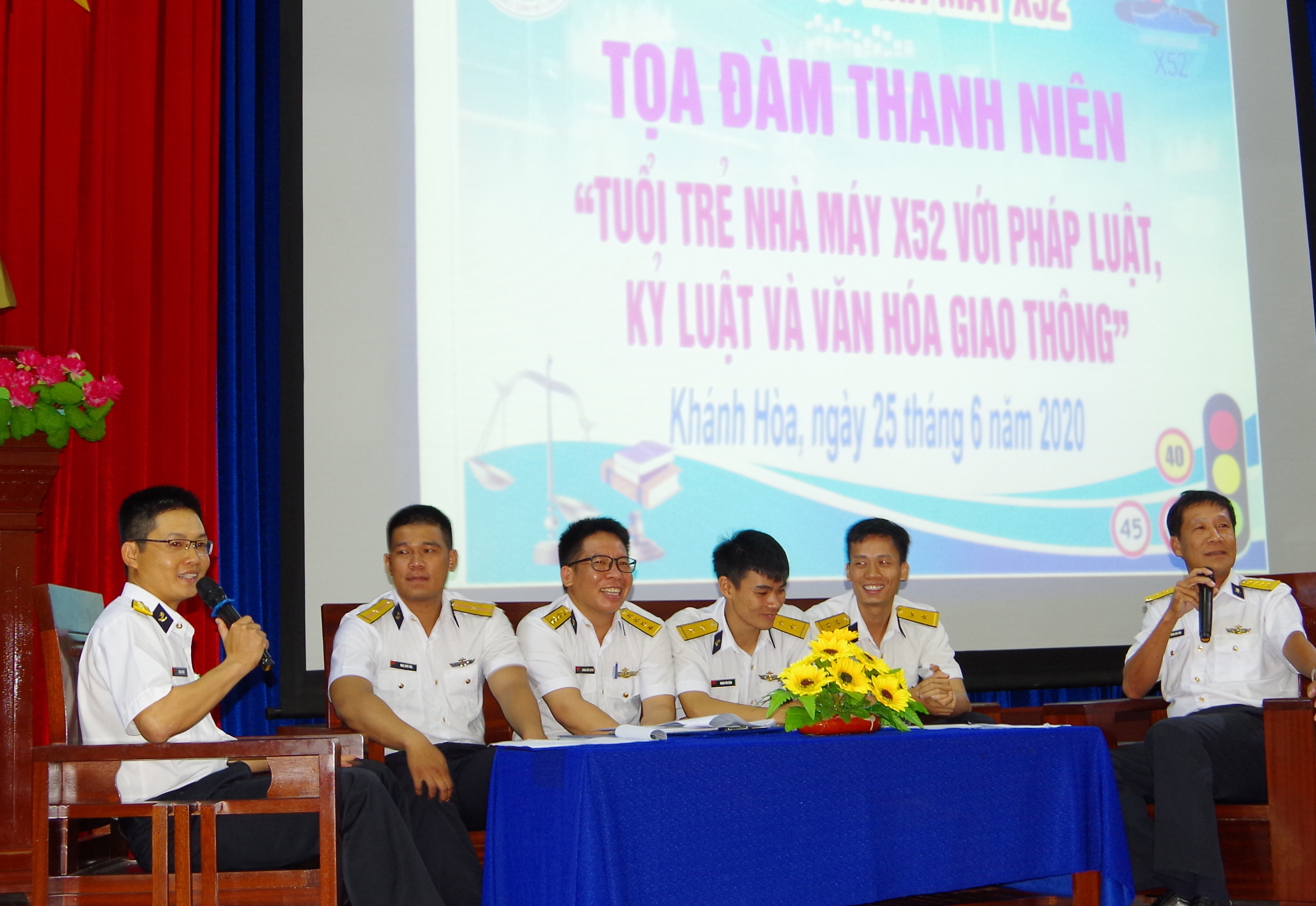 Tối 25-6, tại Cam Ranh, Khánh Hòa, Đoàn cơ sở Nhà máy X52, Cục Kỹ thuật Hải quân tổ chức tọa đàm thanh niên với chủ đề “Tuổi trẻ Nhà máy X52 với pháp luật, kỷ luật và văn hóa giao thông”.