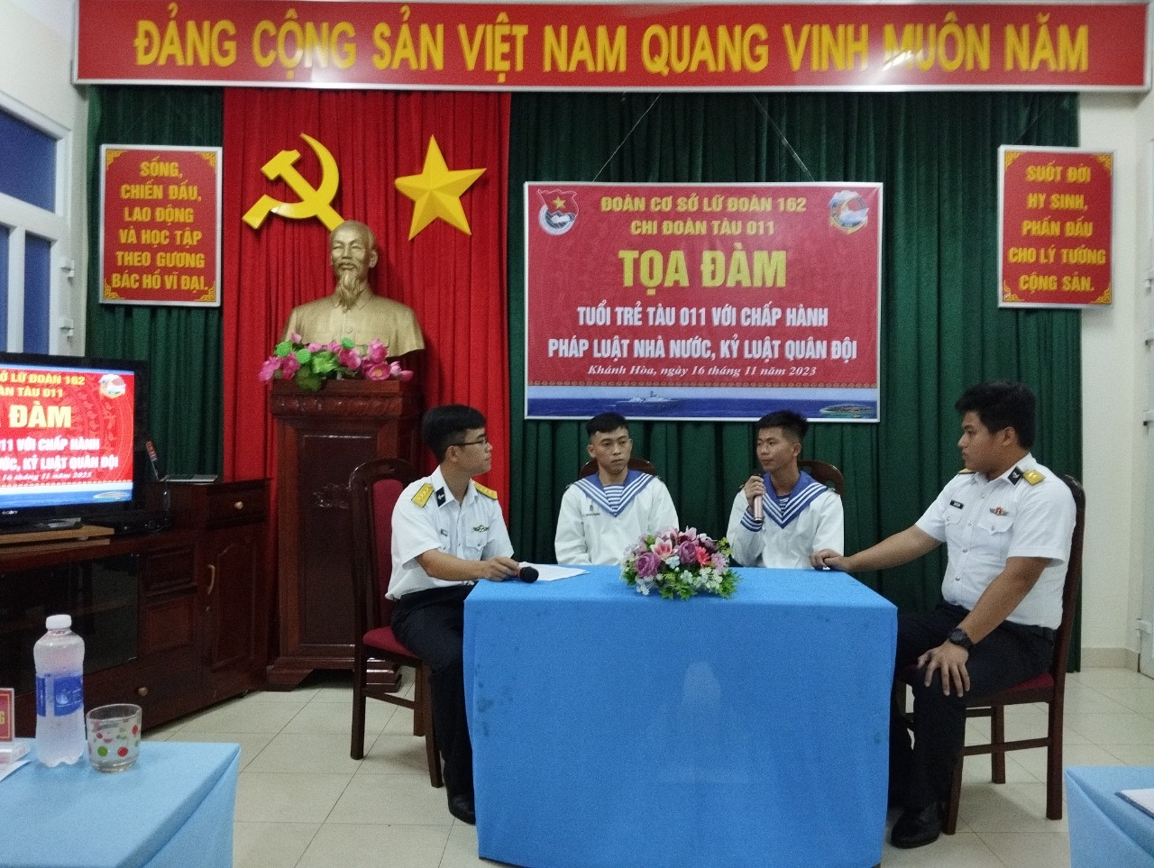Tối 16/11, tại TP. Cam Ranh, tỉnh Khánh Hòa, Chi đoàn Tàu 011 - Đinh Tiên Hoàng, Lữ đoàn 162, Vùng 4 Hải quân tổ chức tọa đàm chủ đề “Tuổi trẻ Tàu 011 với pháp luật nhà nước, kỷ luật quân đội”.