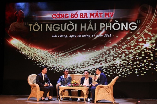 Nhạc sĩ Xuân Bình (ngoài cùng bên phải ảnh) cùng ê kíp thực hiện MV "Tôi người Hải Phòng" giao lưu tại buổi ra mắt MV