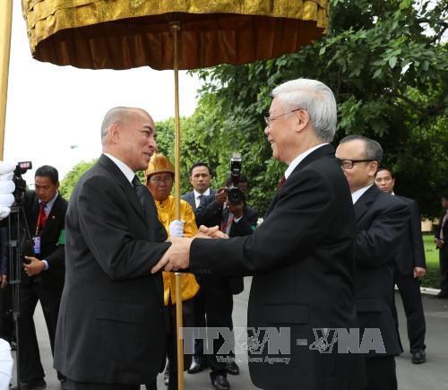 Quốc vương Nô-rô-đôm Xi-ha-mô-ni nhiệt liệt chào mừng Tổng Bí thư Nguyễn Phú Trọng và Đoàn đại biểu cấp cao Việt Nam thăm cấp Nhà nước Vương quốc Cam-pu-chia; khẳng định chuyến thăm lần này của Tổng Bí thư Nguyễn Phú Trọng là một dấu mốc lịch sử đặc biệt quan trọng trong quan hệ láng giềng tốt đẹp, hữu nghị truyền thống, hợp tác toàn diện Việt Nam-Cam-pu-chia, diễn ra đúng vào dịp hai nước tổ chức trọng thể nhiều hoạt động kỷ niệm 50 năm Ngày thiết lập quan hệ ngoại giao. Tổng Bí thư Nguyễn Phú Trọng bày tỏ vui mừng trở lại thăm đất nước Cam-pu-chia anh em tươi đẹp và giàu lòng mến khách sau hơn 5 năm kể từ chuyến thăm hữu nghị chính thức tháng 12-2011, gặp lại Quốc vương Nô-rô-đôm Xi-ha-mô-ni-người bạn gần gũi và thân thiết của lãnh đạo và nhân dân Việt Nam.
