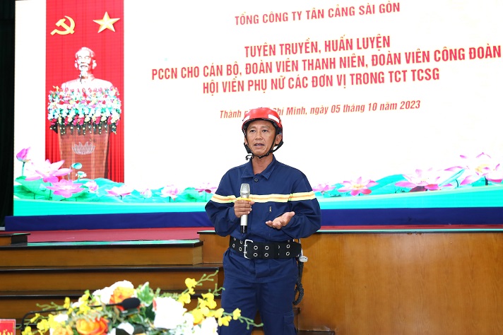 Trung tá Nguyễn Chí Thành chia sẻ kinh nghiệm PCCN&CNCH với cán bộ, người lao động Tổng công ty Tân cảng Sài Gòn