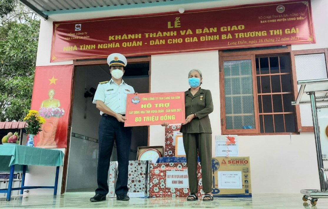 Thừa ủy quyền của Tổng Công ty Tân cảng Sài Gòn, sáng 16/12, tại huyện Long Điền, tỉnh Bà Rịa - Vũng Tàu, Hải đoàn 129 phối hợp với Ban Chỉ huy quân sự huyện Long Điền và chính quyền địa phương tổ chức khánh thành, bàn giao nhà tình nghĩa quân-dân cho gia đình bà Trương Thị Gái.