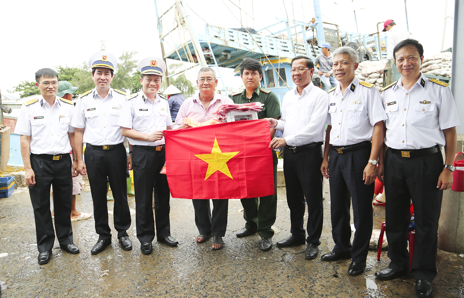Các đại biểu trao tủ thuốc, cờ Tổ quốc, áo phao cho ngư dân
