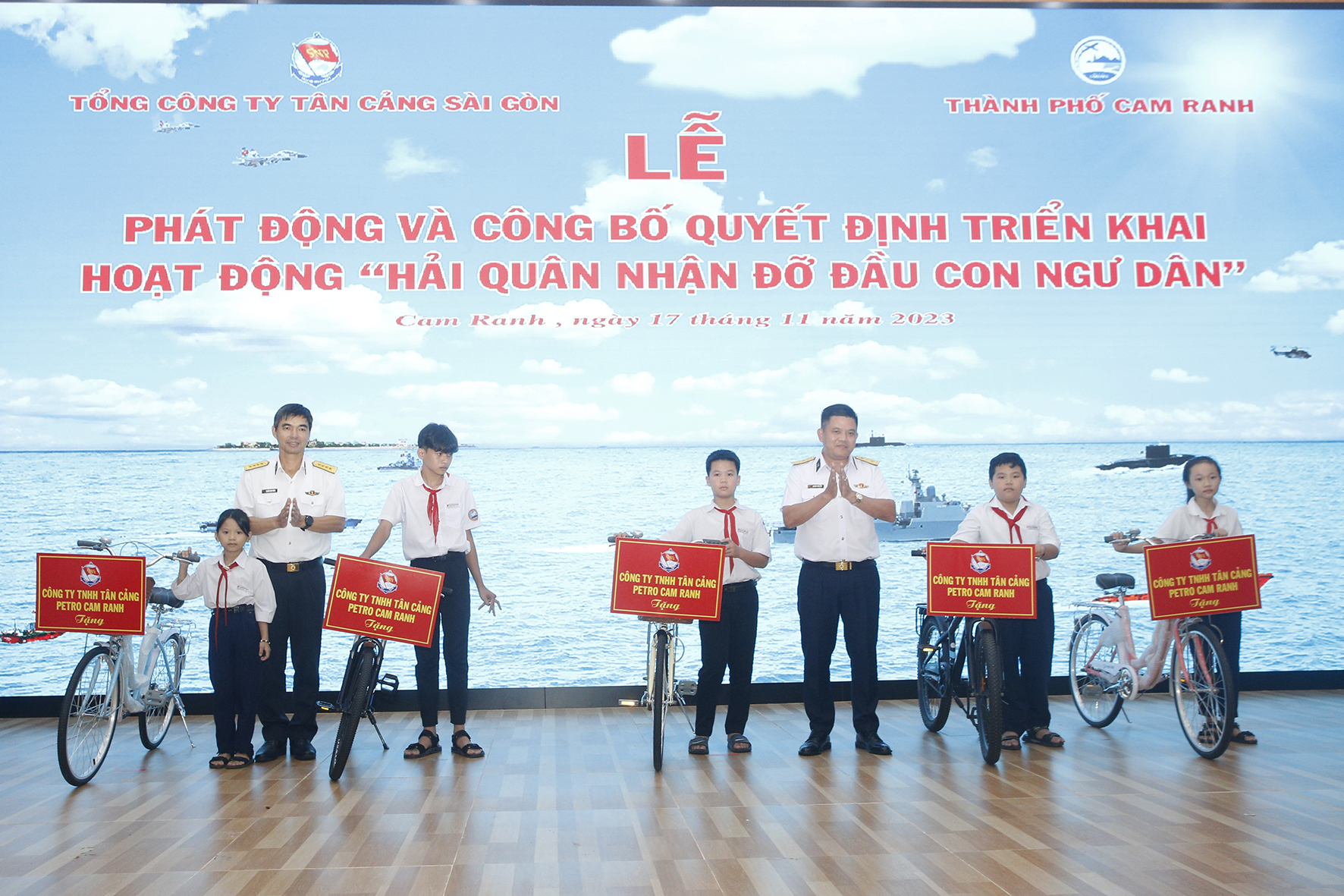 Công ty TNHH Tân Cảng-Petro Cam Ranh tặng 5 chiếc xe đạp cho 5 con ngư dân được nhận đỡ đầu đợt này.