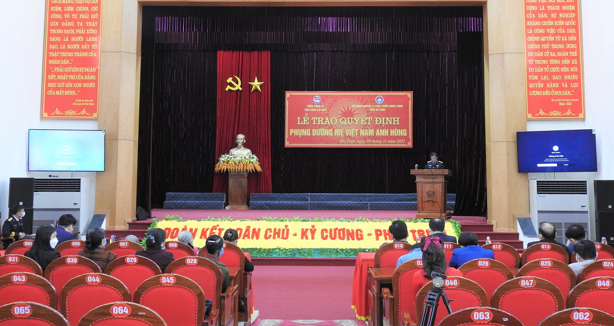 Sáng 30/11, được sự ủy quyền của Tổng công ty (TCT) Tân cảng Sài Gòn, Hải đoàn 128 phối hợp với Sở Nông nghiệp và Phát triển nông thôn tỉnh Hà Tĩnh cùng chính quyền địa phương tổ chức Lễ trao quyết định phụng dưỡng suốt đời 9 Mẹ Việt Nam Anh hùng (VNAH) đang sinh sống trên địa bàn tỉnh.