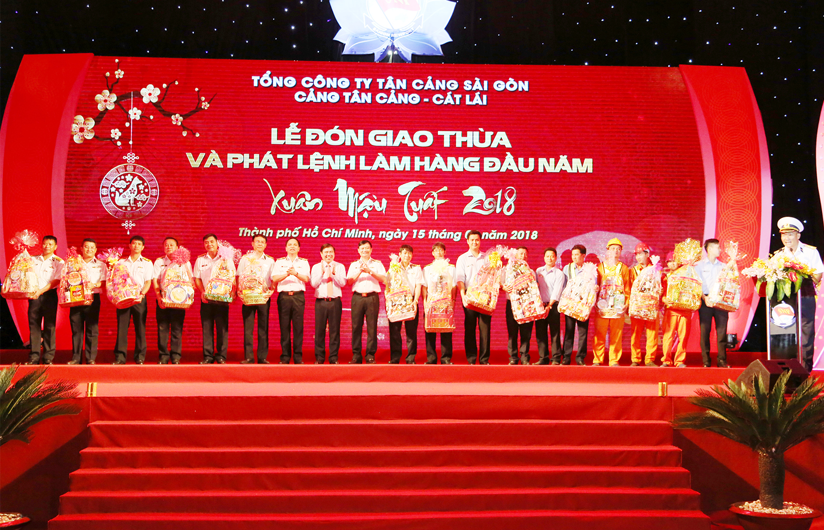 Tối 15-2, tại cảng Cát Lái, TP. Hồ Chí Minh, Tổng công ty Tân cảng Sài Gòn (SNP) đã tổ chức Lễ đón giao thừa Tết Mậu Tuất 2018 và phát lệnh làm hàng đầu năm. Tham dự buổi lễ có các đồng chí: Nguyễn Thành Phong, Ủy viên Trung ương Đảng, Chủ tịch UBND TP. Hồ Chí Minh; Thiếu tướng Trần Hoài Trung, Bí thư Đảng ủy, Chính ủy Hải quân; Chuẩn Đô đốc Phạm Xuân Điệp, Phó Tư lệnh Hải quân; các đồng chí trong Đảng ủy, Ban Tổng giám đốc cùng hơn 600 cán bộ, nhân viên, người lao động Tổng công ty Tân cảng Sài Gòn đang trực tiếp sản xuất, kinh doanh tại cảng Cát Lái.