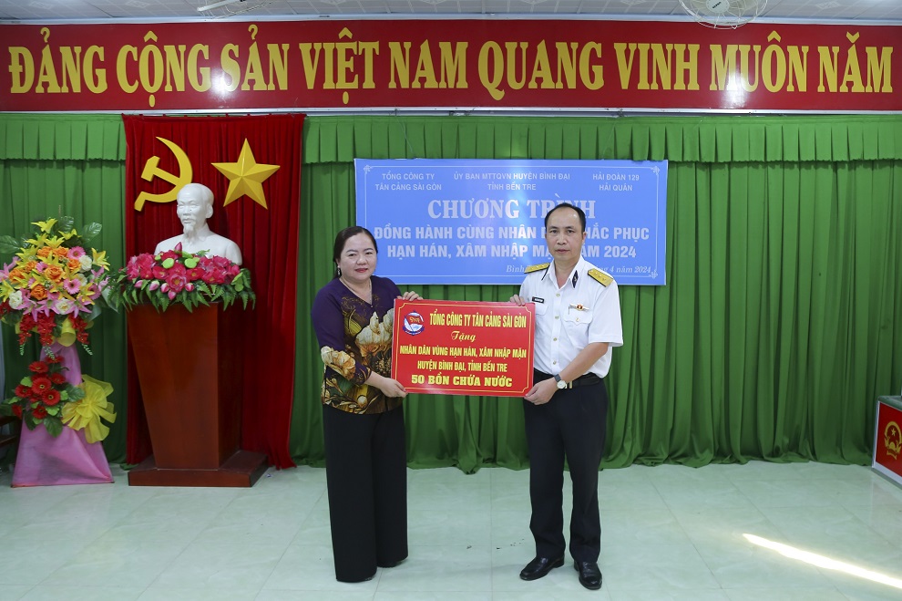 Chiều 21/4, tại xã Bình Thắng, huyện Bình Đại, tỉnh Bến Tre, Tổng công ty Tân cảng Sài Gòn phối hợp với Hải đoàn 129 Hải quân và Ủy ban MTTQ Việt Nam tỉnh Bến Tre tổ chức chương trình hỗ trợ nhân dân khắc phục hạn hán, xâm nhập mặn trên địa bàn.