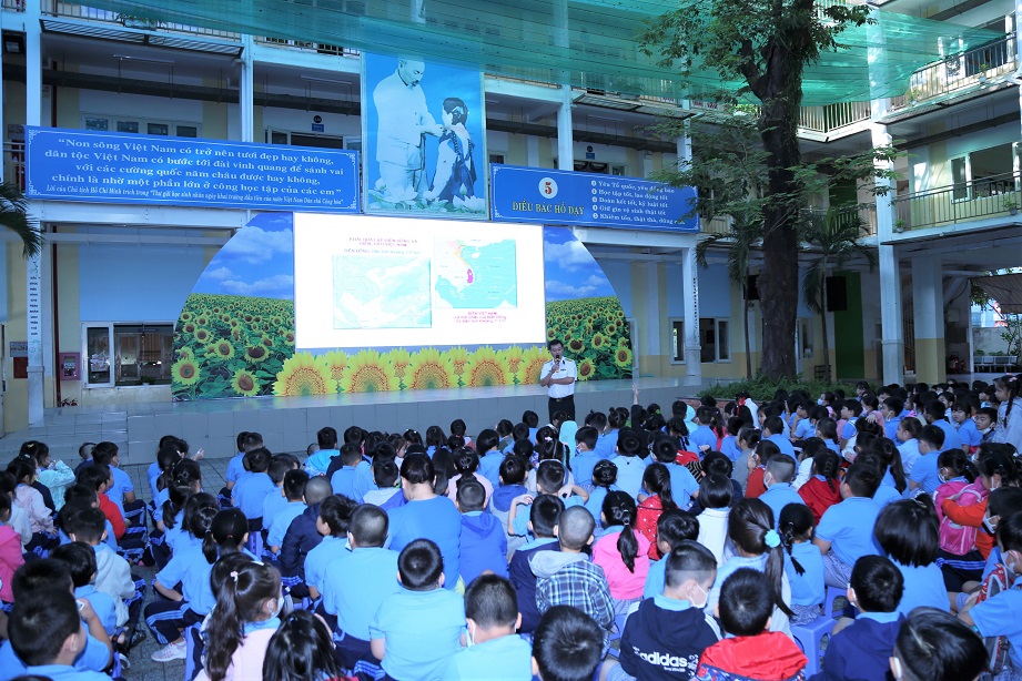 Sáng 19/12, Tổng công ty Tân cảng Sài Gòn tổ chức thông tin về tình hình biển, đảo cho gần 1.400 giáo viên, học sinh Trường Tiểu học Đinh Tiên Hoàng, Quận 1, TP. Hồ Chí Minh.