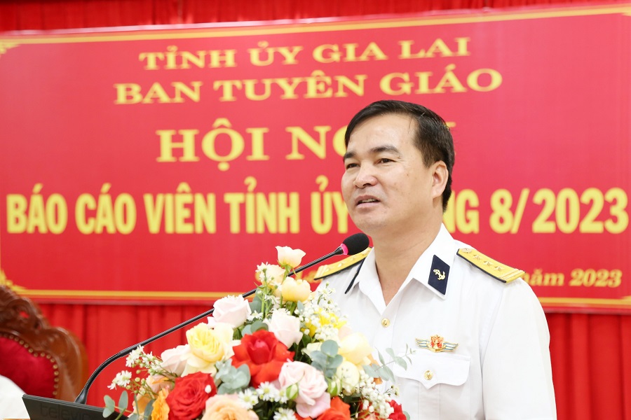 Sáng 25/8, tại TP. Pleiku, tỉnh Gia Lai, đoàn công tác của Tổng công ty Tân cảng Sài Gòn do Thượng tá Đoàn Văn Uẩn, Phó Chủ nhiệm Chính trị Tổng công ty làm trưởng đoàn phối hợp với Ban Tuyên giáo Tỉnh ủy Gia Lai tổ chức Hội nghị báo cáo viên thông tin về tình hình biển đảo bằng hình thức trực tiếp và trực tuyến tại 20 điểm cầu.
