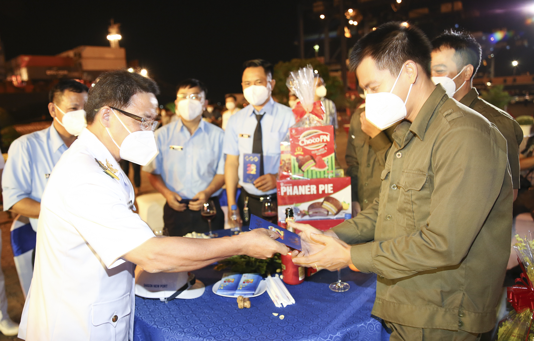 Lãnh đạo TCT Tân cảng Sài Gòn tặng quà cho người lao động đang tham gia sản xuất trong đêm giao thừa