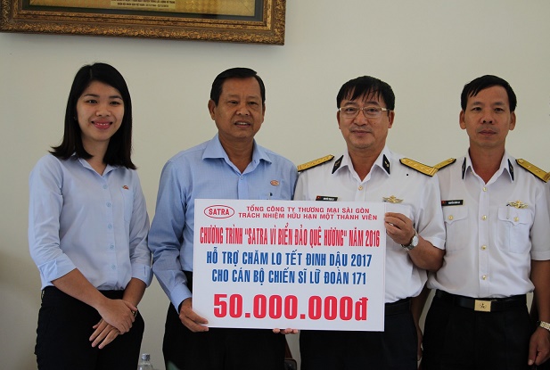 Trước đó, công ty này cũng đã tặng cho hai đơn vị là Lữ đoàn 125 Hải quân và Trung đoàn ra đa 251 (Thuộc Vùng 2 Hải quân) mỗi đơn vị 50 triệu đồng. Ông Ngô Thịnh Hưng, Phó trưởng ban Tuyên giáo Đảng ủy Tổng công ty Thương mại Sài Gòn cho biết, Tổng công ty bắt đầu thực hiện chương trình “Satra vì biển, đảo quê hương” từ năm 2011. Đến nay, cán bộ, công nhân viên của Tổng công ty đã đóng góp cho chương trình “Satra vì biển đảo quê hương” trên 13 tỷ đồng. Riêng năm 2016, Tổng công ty đã giúp đỡ ngư dân mua sắm ngư cụ, chài lưới và ủng hộ cán bộ, chiến sĩ hải quân ở các đơn vị Trường Sa, DK1 trên 2 tỷ đồng.